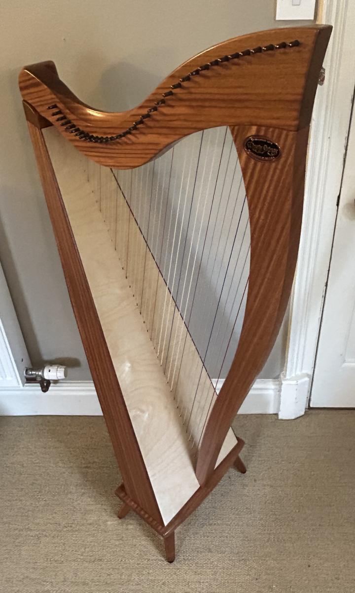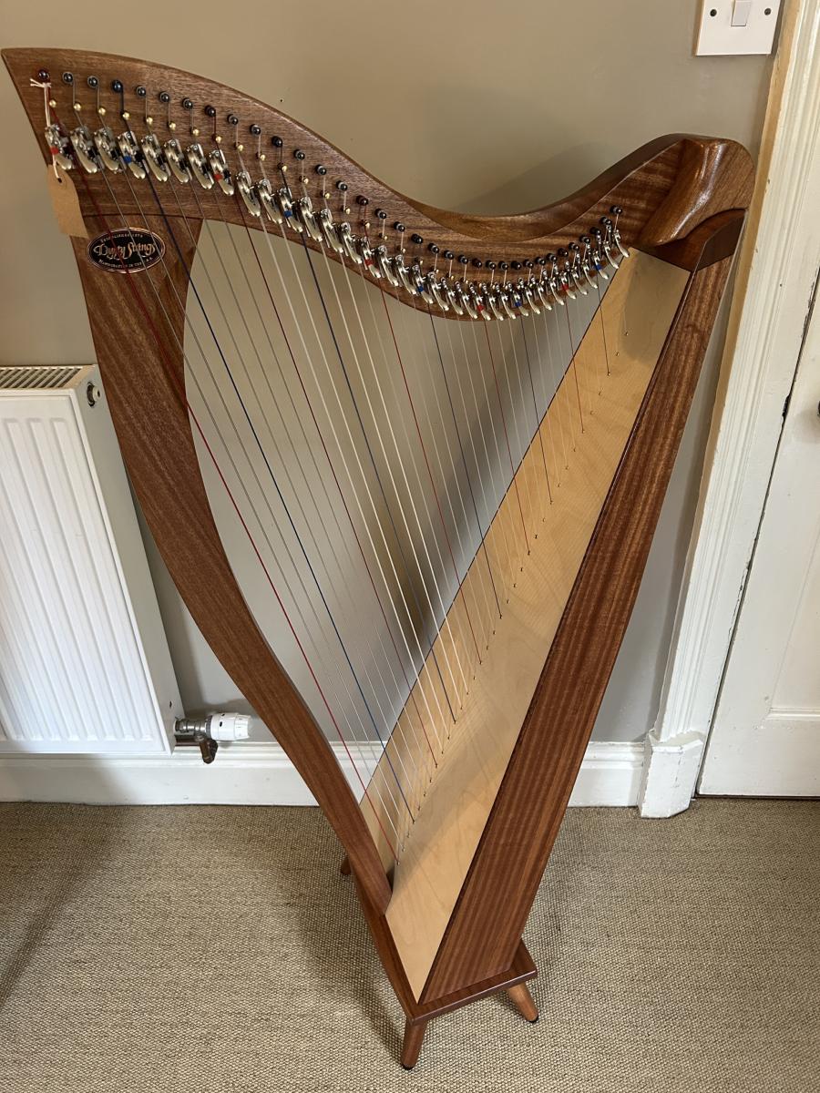 To keep the carrying size to a minimum while giving maximum flexibility of playing height, the Crescendo 34 includes an innovative removable stand. This nestles into the base of the harp, attaching in seconds with the twist of a knob and without having to turn the harp upside down. For those who like a lower height, the harp balances perfectly on the ground without the stand.